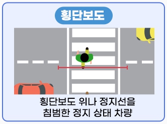 횡단보도위나 정지선 주정차 금지 ▶ 횡단보도 위나 정지선에 차량을 세우는 것을 금지하고 있습니다. 이는 보행자의 시야를 가려 보행자의 안전을 위협하기 떄문입니다. ▶ 승용차 4만원, 승합차 5만원 과태료 부과 |