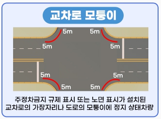 교차로 모퉁이 5미터 이내 주정차 금지 ▶ 교차로 모퉁이 5미터 이내 구역에 차량의 주정차하는 것을 금지하고 있습니다. 이는 모퉁이에 주차를 할 경우 차량의 교통흐름을 방해 또는 사고의 위험을 높일수 있기 때문입니다. ▶ 승용차 4만원, 승합차 5만원 과태료 부과 |