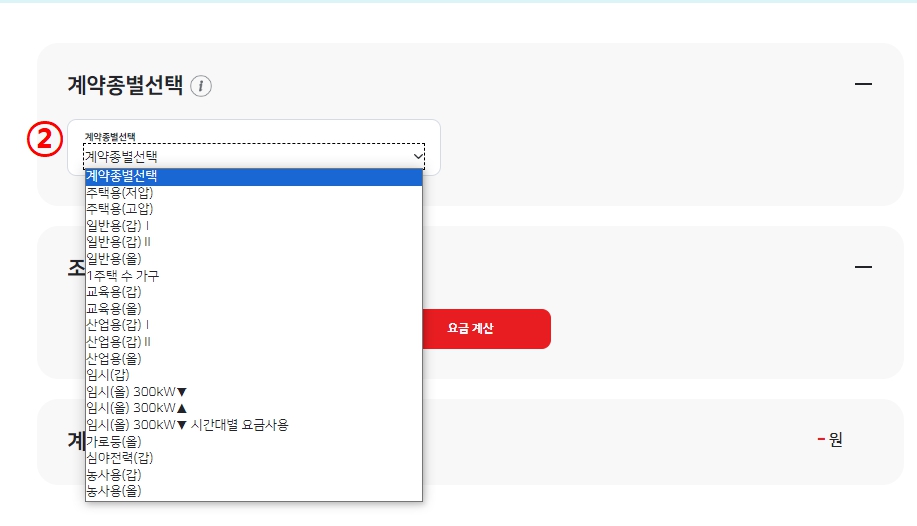 ② 주택용(저압,고압), 일반용, 교육용 다양한 종류가 있으며, 본인이 해당하는 계약종별을 선택하세요.
