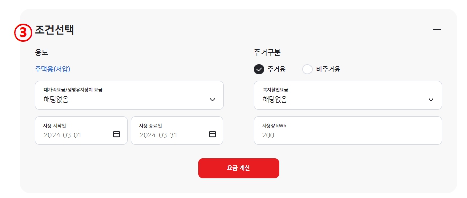③ 사용기간, 복지할인요금, 사용량 등 계산하시고자 하는 용도에 맞게 선택 후 요금계산을 누르세요.