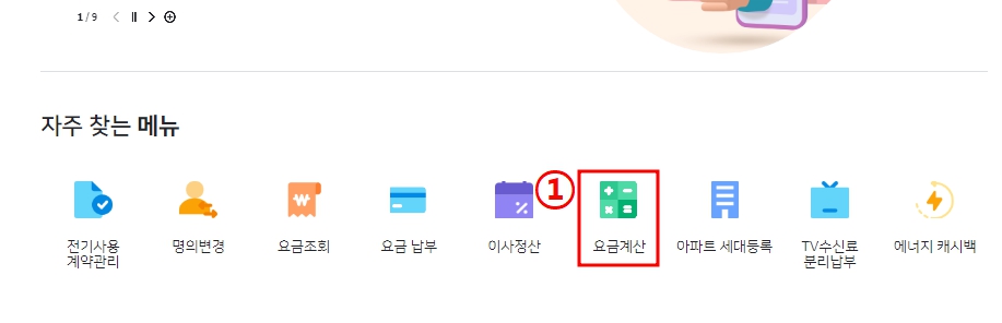 ① 한전ON 홈페이지에서 자주찾는 메뉴 "요금계산"을 누르세요.